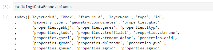 Der Datensatz beginnt nicht direkt als Array, sondern als Objekt mit einem einzigen Attribut mit der Bezeichnung “results”. Und erst dieses Attribut enthält als Wert das gewünscht Array. Aber kein Problem, die json_normalize()-Methode hat genau diesen Fall vorhergesehen und bietet uns eine Möglichkeit an, dieses Problem zu lösen. Der Methode können zwei Parameter übergeben werden: Der erst Parameter ist das zu parsende JSON-Objekt selbst. Der zweite Parameter hat die Bezeichnung record_path, bei diesem kann das Wurzel-Attribut angegeben werden, unter dem sich das Nutzdaten-Array befindet, in unserem Fall also “results”: Wir rufen die Methode in unserem fünften Schritt entsprechend auf und speichern das Ergebnis in der Variablen buildingsDataFrame: