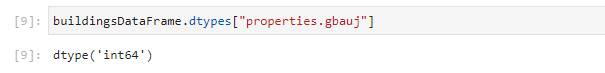 Wenn wir nun die komplette Liste durchgehen, finden wir irgendwo dazwischen auch die Spalte “properties.gbauj”. Wenn wir nach dem Code “GBAUJ” im oben angegebenen Dokument MMK 4.1 suchen, dann erfahren wir, dass es sich hierbei um das Baujahr des Gebäudes handelt. Schauen wir uns den Datentyp der Werte in der Spalte “properties.gbauj” an: