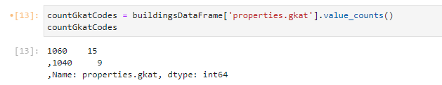 Wir beginnen mit einem Beispiel für die univariate Analyse. Schauen wir uns dazu die Spalte “properties.gkat” an. Laut der Spezifikation MMK 4.1 beinhaltet GKAT Codes für Gebäudekategorien. Schauen wir uns mit der Methode value_counts() an, welche Code-Werte uns in unserem Datensatz erwarten. Wir speichern das Ergebnis der Berechnung in der Variable countGkatCodes und lassen uns den Inhalt der Variable gleich ausgeben: