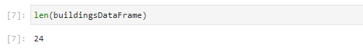 Um zu erfahren, wie viele Gebäude wir nun tatsächlich vom Webservice erhalten haben, rufen wir die globale Funktion len() auf und übergeben das gesamte DataFrame als Parameter: