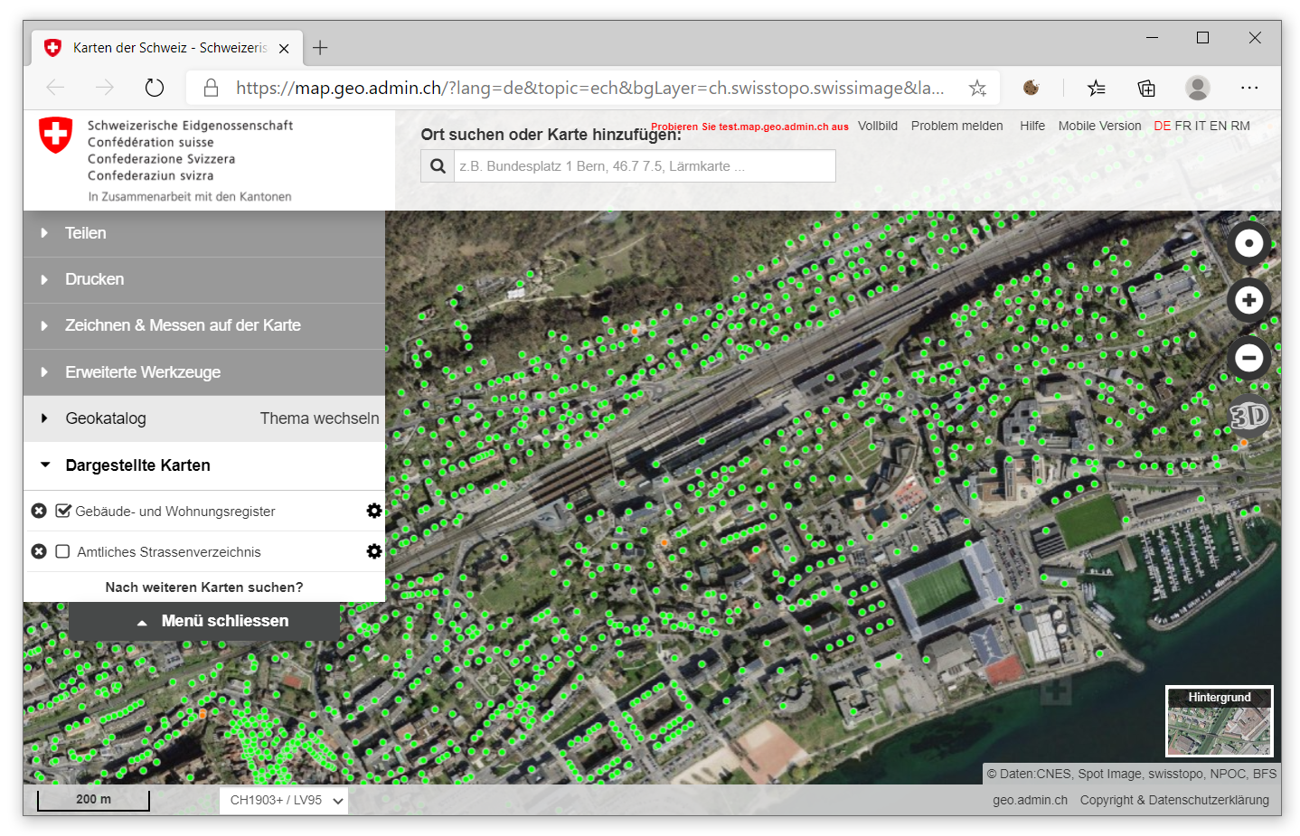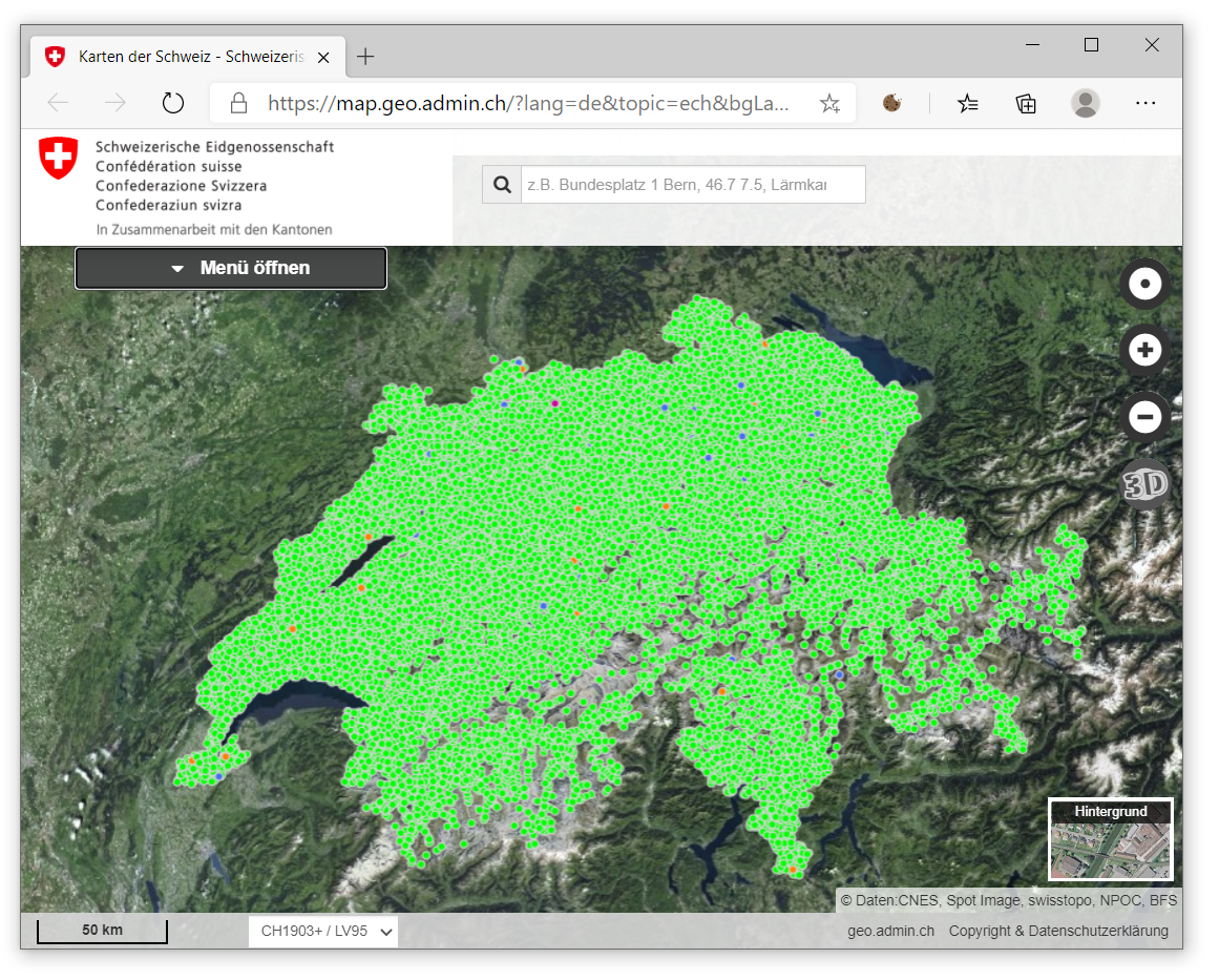 sehen wir mittig die Einblendung einer interaktiven Online-Karte, die uns bereits die Positionen von Gebäudeeingängen anzeigt - jeder grüne Punkt repräsentiert ein bestehendes Gebäude. Dabei handelt es sich um eine Einbettung des Kartenviewers der swisstopo. Per Klick auf “In map.geo.admin.ch ansehen” öffnen wir den Kartenviewer in einem eigenen Browser-Fenster: