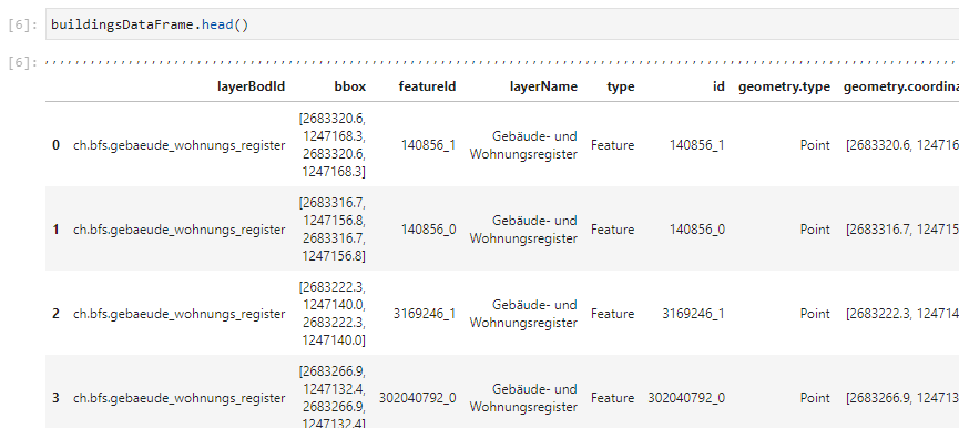 Das Ergebnis zeigt nur die ersten fünf Zeilen der Tabelle und nicht das gesamte DataFrame an, um das Notebook nicht zu überfrachten. Trotzdem gewinnen wir dadurch bereits einen guten Eindruck darüber, wie die Daten eingelesen wurden und können so bereits hier grobe Fehler im Prozess identifizieren. Zugleich können wir hier zufällig erkennen, dass uns auch Koordinaten der Gebäude mitgeliefert werden. Genaugenommen erhalten wir den Zentrumspunkt der Gebäude als Koordinaten im Schweizer Koordinatenbezugssystem LV95.
