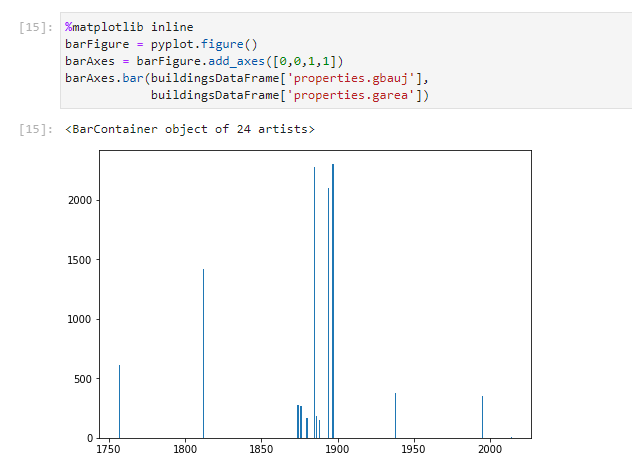 Im letzten Schritt rufen wir die Methode bar() am barAxes-Objekt auf und übergeben dieser die beiden Merkmale, die wir in Beziehung setzen wollen, also die Spalte “properties.gbauj” (für die x-Achse) und die Spalte “properties.garea” (für die y-Achse).