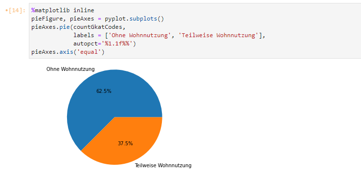Als nächstes erzeugen wir durch den Aufruf der Methode subplots() am pyplot-Objekt ein neues Figure- und ein Axes-Objekt, die jeweils das Diagramm selbst (pieFigure) und die Diagramm-Achsen (pieAxes) repräsentieren. Am pieAxes-Objekt können wir die Methode pie() aufrufen, an die wir drei Parameter übergeben. Der erste Parameter sind die aufgezählten Werte der Codes, also das Ergebnis des Vorschrittes, die Variable countGkatCodes. Im zweiten Parameter, mit der Bezeichnung labels, übergeben wir die Beschriftung der einzelnen Attribute. Hier könnten wir einfach die Code-Werte wiederholen, schöner ist es sicherlich, wenn wir die Code-Werte gleich “übersetzen” und ihre Bedeutung, also “Ohne Wohnnutzung” und “Teilweise Wohnnutzung” mitgeben. Im letzten Parameter autopct stilisieren wir die Darstellung der Prozentwerte innerhalb des Tortendiagramms mit der Angabe “%1.1f%%”. Die Zahlenwerte geben die Anzahl der (Mindest-)Stellen vor und nach dem Punkt an. In diesem Fall ist eine Vor- und eine Nachpunktstelle definiert.
