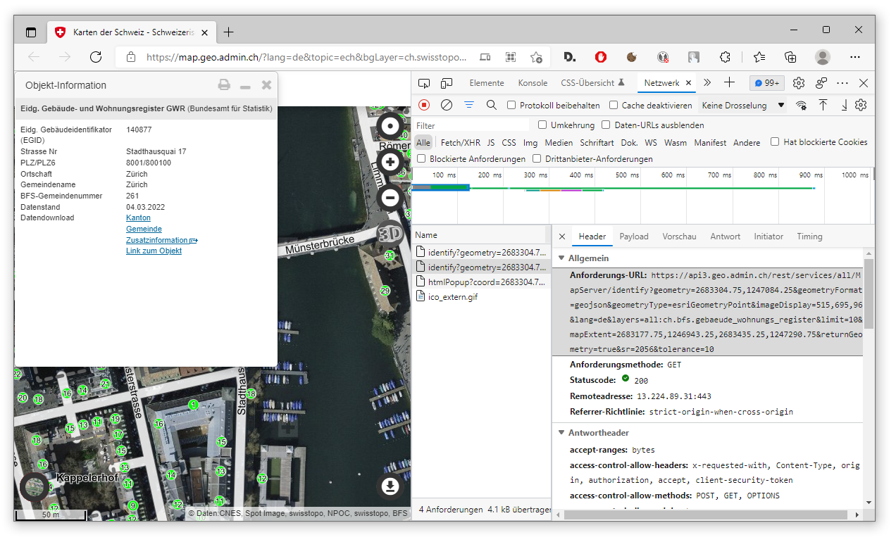 geoAdminUrl = "https://api3.geo.admin.ch/rest/services/"Um unsere Anfrage-URL an den Webservice so zu formulieren, wie wir diese benötigen, schauen wir uns zunächst die vollständige Anforderungs-URL aus den F12-Tools aus dem Beispiel von weiter oben an (Stadthaus in Zürich) und passen diese unseren Wünschen entsprechend an. Insbesondere ist es von Interesse, den Umkreis der Anfrage frei wählen zu können. Die vollständige Anfrage-URL lautet: