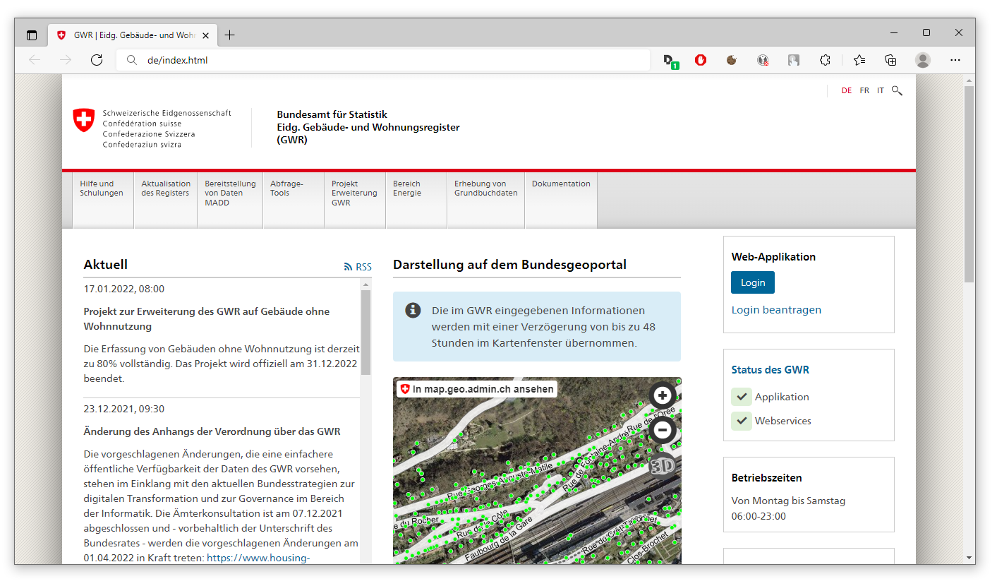 Die Schweiz verfügt mit dem nationalen Gebäude- und Wohnungsregister (GWR) über ein weltweit einzigartiges System. Das GWR beinhaltet aktuelle Daten über alle Gebäude und Wohnungen in der gesamten Schweiz. Damit kann die Bautätigkeit über das gesamte Land beobachtet, untersucht und zwischen den einzelnen Regionen verglichen werden. Es lassen sich vielfältige Rückschlüsse über den Zustand und die Qualität des nationalen Gebäude- und Wohnungsbestands ziehen und bei Bedarf entsprechende wirtschaftspolitische Massnahmen erarbeiten. Aber wie können auch Sie als technisch interessierter Bürger vom GWR profitieren?