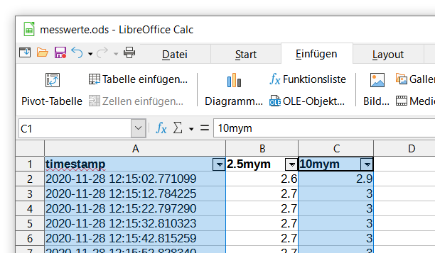 Damit wir die etwas umständliche Einheit des Sensors in unser vertrautes Mikrogramm übersetzen, teilen wir den Wert durch 10. Anschliessend protokolliert das Programm das aktuelle Datum, die Uhrzeit und die beiden Messwerte ordentlich getrennt durch ein Semikolon in einer eigenen Datei namens messwerte.csv. Nach jedem Eintrag legt das Skript für zehn Sekunden eine kleine Pause ein (time.sleep(10)), bevor es von neuem misst.