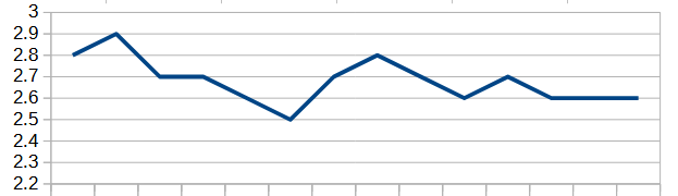 In diesem Testlauf schwanken die PM10-Werte über sechs Minuten hinweg gemütlich zwischen 2.5 und 2.9 μg/m^3. Das ist saubere Luft.