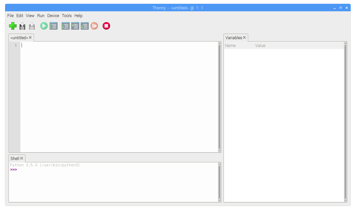Die Oberfläche ist aufgeräumt: Oben links schreiben wir unseren Code, rechts sehen wir unsere Variablen, und unten links befindet sich die Shell, die Konsole. Stellen Sie sicher, dass unten in der Shell “Python 3…” steht.